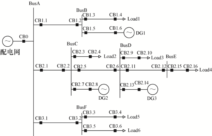 随着分布式电源的普遍应用,配电网中往往接入多个分布式电源。当多个分布式电源接入电网时,为了区分,在选择注入特征信号时,选取注入不同频率的特征信号以此来区分不同的分布式电源。本节以图5 所示配电网为例,分析当多个IIDG分别注入不同特征信号的保护方案。