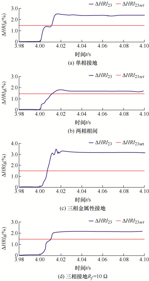 图8 所示$\Delta HR{{I}_{hf}}$ 均满足动作条件,各类故障条件下保护均可以成功动作。且可以看出在故障点位置相同的情况下,三相金属性接地故障的故障特征最为明显。