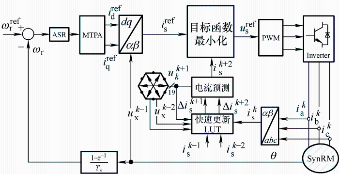 ... 同步磁阻电机(Synchronous reluctance motor, SynRM)由于其转子结构简单、成本低、调速范围广的优点在工业传动和电动汽车中得到广泛应用[1].SynRM驱动的控制方法有磁场定向控制(Field oriented control, FOC)[2-3]、直接转矩控制(Direct torque control, DTC)[4]和模型预测控制(Model predictive control, MPC)[5⇓⇓⇓⇓-10]等.在SynRM驱动控制中,为简化系统描述,常假设电机参数固定,不考虑电感磁饱和,而在实际运行工况中,受主磁路饱和与交叉饱和的影响,电机参数并非定值,严重影响电机的高性能控制[11-12].对电机参数进行离线或在线辨识能够减少参数不匹配的影响,但存在计算量大、精确性以及稳定性低的问题[13-14].文献[15]研究了在线电感自适应算法,然而在线多参数识别存在秩不足的问题,因此可能需要额外的信号注入来达到满秩条件.此外,由于逆变器的非线性和不同参数之间的耦合效应,在低速或小电流工况下难以实现良好的精度.为了获得较好的控制性能,现有文献提出利用扰动观测器的方法来观察由参数误差引起的扰动项并进行补偿[16-17].文献[16]在基于连续时间的预测控制方法中增加了扰动观测器,当电机参数发生变化或外部干扰时,电机驱动仍能保持良好的控制性能.文献[17]则使用龙贝格观测器来估计下一个控制周期的定子电流和电机参数失配引起的扰动.现有文献中还提出了自适应互补滑模控制[18]和鲁棒预测电流控制[19]等控制策略来抑制参数摄动和外部电压扰动的负面影响.然而,这些方法需要较大的计算量,并且其性能取决于观测器参数的设计和调整,这增加了控制器的设计工作. ...