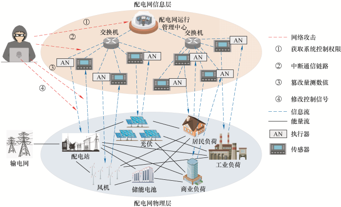 ... [6]、虚假数据注入攻击[7⇓⇓-10]等),对攻击原理、攻击对象以及攻击建模方法进行了总结;在网络攻击防御保护方面,文献[7,10⇓-12]在对不同网络攻击形式进行具体分析的基础上,总结了相应防御检测与保护方法.文献[13⇓-15]则针对具体电力业务场景(如广域量测系统[15]、变电站自动化系统[14]等),分析其可能受到的网络攻击影响过程,总结了缓解网络攻击影响的系统弹性运行策略;在电网可靠性评估方面,文献[6,9,12,16]分析了网络攻击对电力系统运行造成的影响,提出了网络攻击背景下的电网可靠性评估方法与体系架构.需要注意的是,当前研究大多仅聚焦于某一特定网络攻击形式或特定电力业务场景,且大部分文献是对主网层面智能电网信息安全研究工作的总结,尚未有覆盖配电网与微电网层面,面向SPDU-CPS的网络攻击防御与恢复研究的文献. ...