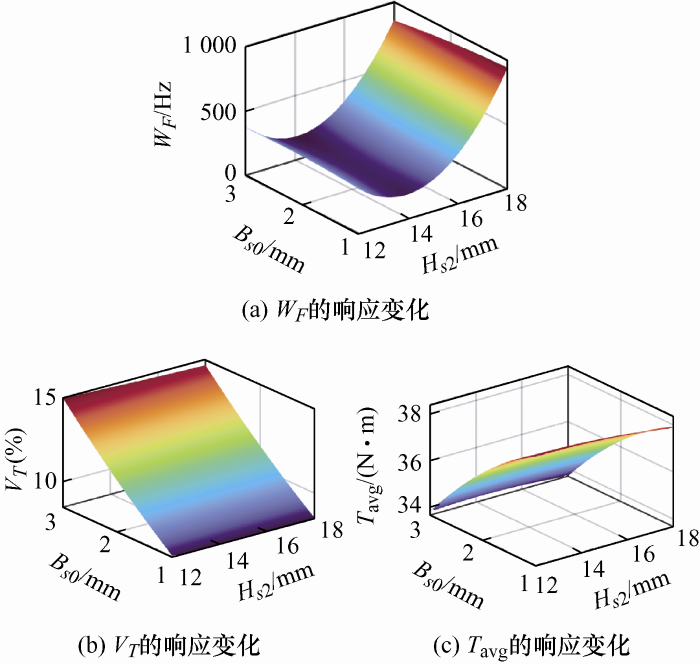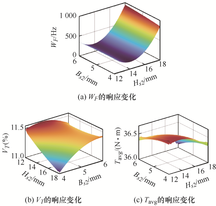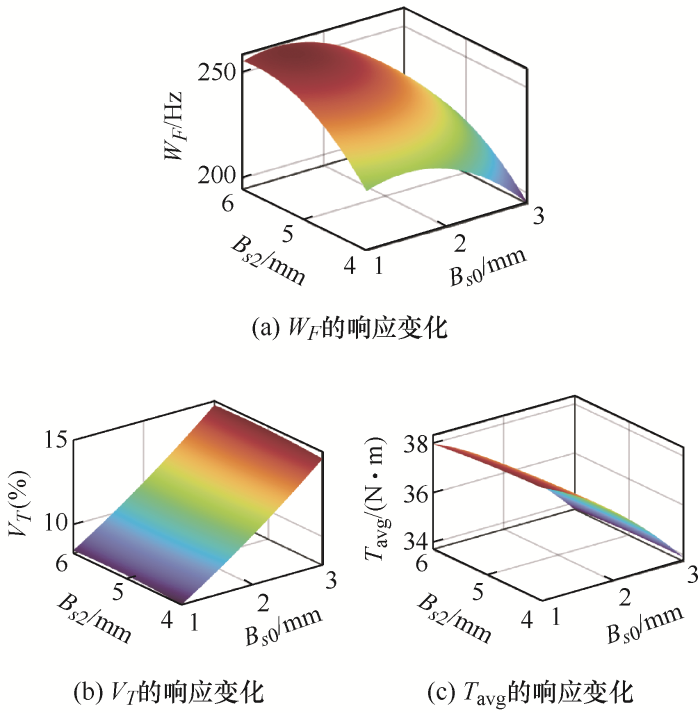 综上所述,对电机振动噪声的抑制可通过电机结构进行优化设计来实现,在抑制电机振动噪声的同时需要保证电机的输出性能。因此,本文首先对原型样机进行电机振动噪声的试验分析,揭示了电磁噪声的产生机理,电机振动噪声抑制的关键在于避免模态振型和频率与电磁力的力型和频率接近,可通过电机结构参数优化调整模态频率避免共振以抑制振动噪声。然后,通过改变电机定子的结构参数来调整电机定子的固有频率并分析结构参数的敏感性,在不降低电机输出性能的前提下,将引起主要噪声的电磁力频率和定子固有频率错开,避免产生共振。随后采用响应面法建立优化目标与优化变量的数学模型并验证了所建响应面模型的正确性,再利用遗传优化算法确定了最佳优化参数。最后将优化前后电机有限元结构模型的电磁噪声进行对比,验证了基于响应面法和遗传算法的电机振动噪声抑制的有效性。