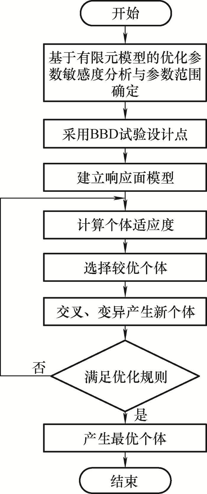为寻求目标函数的全局最优解,将响应面模型与遗传算法相结合,利用响应面得到的拟合方程计算个体的适应度,通过遗传算法得到优化变量的全局最优解。遗传算法具有鲁棒性强、计算速度快和可并行处理等优点,遗传算法的具体流程如图11 所示。