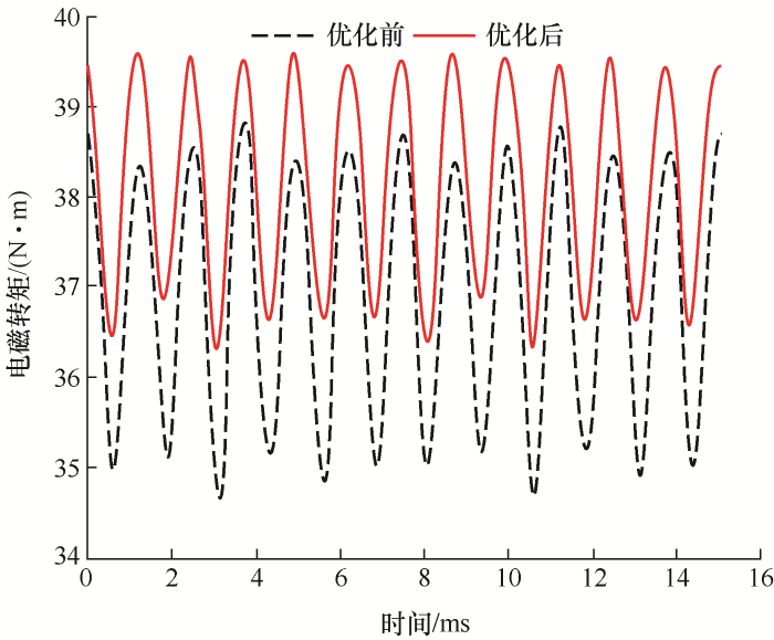 电机优化前后的输出转矩如图12所示,优化后电机的输出转矩明显提高,其中平均输出转矩由优化前的36.8 N·m增大到38.2 N·m,增幅为3.9%。另外,转矩波动也得到了一定的抑制,由优化前的11.33%减小到8.72%。说明本文的优化方法能够有效提高电机性能。