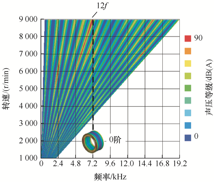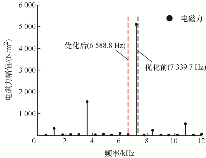 对电机定子结构优化后,电机定子的固有频率发生了变化,优化前定子总成的0阶、2阶、3阶、4阶、5阶、6阶固有频率分别为7 339.7 Hz、829.9 Hz、2 222.0 Hz、3 986.9 Hz、5 916.9 Hz、7 755.3 Hz,优化后定子总成的0阶、2阶、3阶、 4阶、5阶、6阶固有频率分别为6 588.8 Hz、620.3 Hz、1 663.1 Hz、2 988.7 Hz、4 435.6 Hz、5 798.1 Hz,由于定子总成0阶固有频率由7 339.7 Hz调整为6 588.8 Hz,远离0阶电磁力12f(7 200 Hz),如图13所示,有效避免了共振的产生。