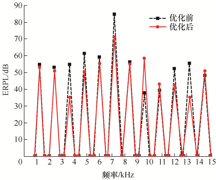 表8给出了电机优化前后ERPL的最大值、平均值及优化效果。可以看出,优化后电磁噪声的最大值和平均值都有所减小,其最大值由优化前的85.08 dB减小到71.22 dB,降幅为16.3%,平均值由优化前的54.14 dB降低到50.20 dB,降幅为7.3%,优化效果比较明显。