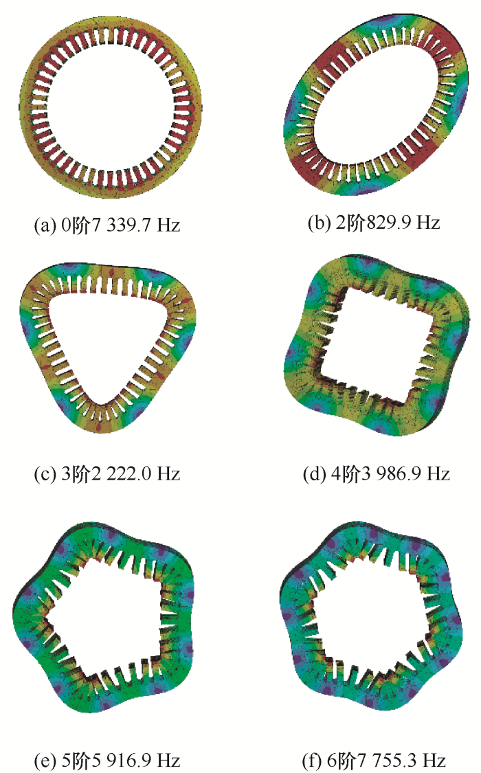 当电磁力频率与电机的固有频率相等或接近时,电机将产生结构共振。本文采用有限元法对电机模态进行计算分析。产生振动主要部件为定子总成,定子总成包括定子铁心与绕组,由于绕组主要影响定子铁心的固有频率对其振型影响较小,因此将绕组质量附加到定子齿部,对电机定子总成建立有限元模型并附上材料属性(密度为7 800 kg/m3,弹性模量为205 GPa,泊松比为0.3)。通过有限元法计算得到电机定子总成各阶模态振型和频率,如图5所示。