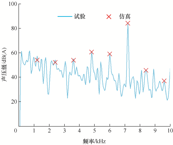 电机在加速工况下,对信号采集器所采集的数据进行傅里叶变换,可以得到电机在整个运行转速范围内的噪声频谱图,结果如图2所示。由图2可知,电机噪声的阶次成分比较复杂。其中,由于电机转子在装配时不可避免存在一定误差,电机存在转子不平衡噪声,出现低阶次的噪声[15]。随着转速的升高,噪声阶次会向右移动,产生多阶次的电磁噪声,其48阶(12f)电磁噪声最为突出,噪声峰值为85.082 dB(A)。对试验电机进行电磁噪声仿真,结果如图3所示,噪声峰值为84.961 52 dB(A),对比图2和图3可知,试验结果与仿真结果基本一致,均在12f(7 200 Hz)处产生明显的共振而辐射较高的噪声,对电机噪声的贡献占主要部分。图4显示了电机在转速为9 000 r/min、负载为20 N·m时仿真和试验声功率频谱图,电机基波电频率f=600 Hz时,存在较大的电磁噪声,此处的噪声主要是由于r=0阶电磁力的频率12f(7 200 Hz)接近电机结构的0阶模态频率而产生共振引起的[16]。