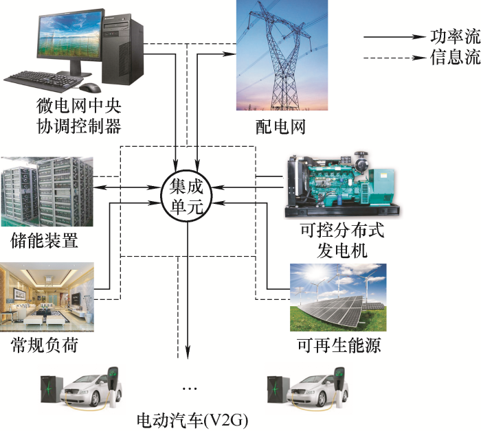 图1为包含可控分布式发电机、储能装置、可再生能源、常规负荷及电动汽车的典型微电网模型,微电网中央协调控制器通过灵活调整各设备输出功率,生成满足负荷需求的最优调度方案。