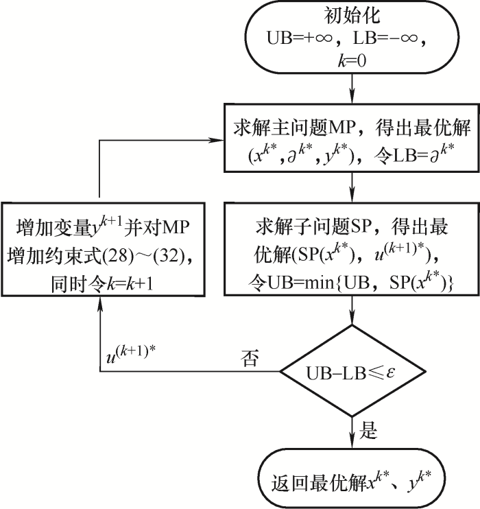 针对式(21)~(25)所示的两阶段鲁棒优化模型,本文采用基于不同割平面策略的列约束生成算法[20]对其进行求解,将该模型分解为一个主问题(Main problem,MP)和一个子问题(Sub problem,SP),主问题用来求解第一阶段优化的离散决策变量,子问题用来求解第二阶段优化的连续决策变量。