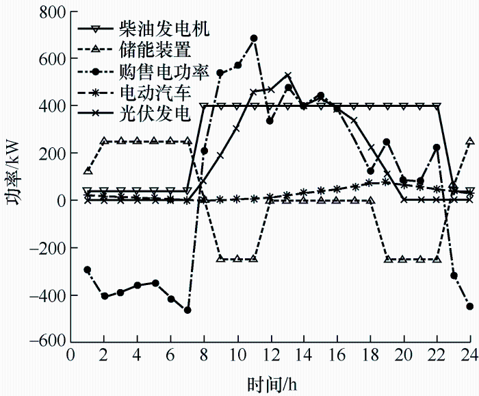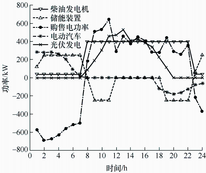 策略2,即电动汽车有序充放电模式下,由图9可以看出,0~7时,电动汽车集中充电,此时交易电价较低,因此微电网向配电网购电以满足负荷需求;8~17时,电动汽车在使用过程中,无充放电行为,此时光伏产生功率,且交易电价高于柴油发电机运行成本,因此柴油发电机以最大功率状态运行,同时微电网向配电网售电以减少运行成本;18~24时,微电网处于负荷高峰期,电动汽车在此时充当蓄电池进行放电,减轻微电网供电负担。