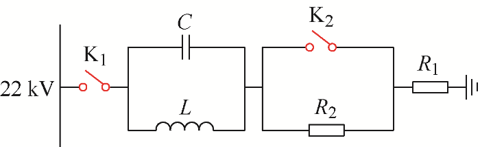 图1给出了本文研究的电能质量治理方案中所采取的阻波高通滤波器结构图。该特殊设计的阻波高通滤波器计划安装于22 kV交流母线,其中L为滤波电感,C为滤波电容,R1为限制基频电流大小的运行小电阻以降低滤波器的运行损耗,R2为主要起限制冲击电流的充电电阻,K1为滤波器的投退开关,K2为滤波器的模式切换开关。