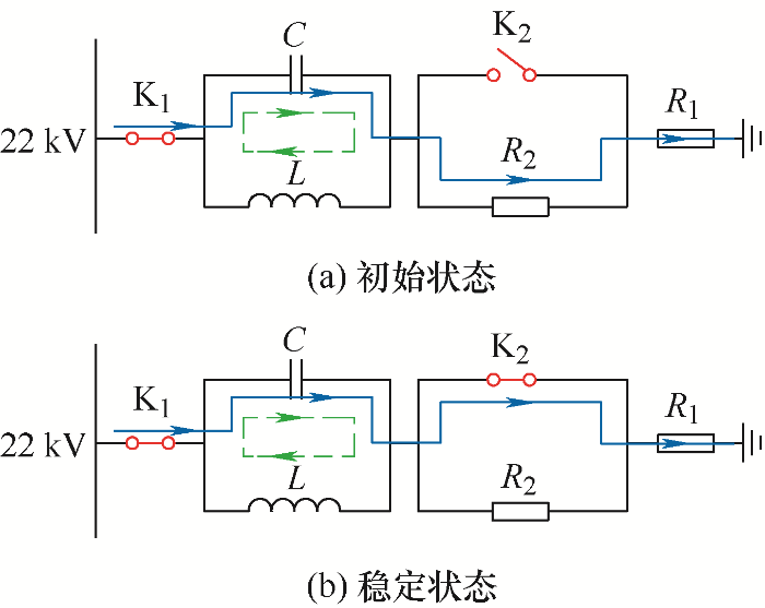 (2) 对滤波电容C充电完毕后,闭合开关K2,充电电阻R2被短接,如图5b所示。此时阻波高通滤波器开始正常进行谐波抑制工作,系统谐波电流经开关K2所在支路进行抑制。