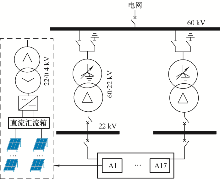 1台交流侧额定电压为385 V、容量为2 200 kV·A的逆变器,经箱变升压并汇集后接于单母线分段接线方式的22 kV母线。