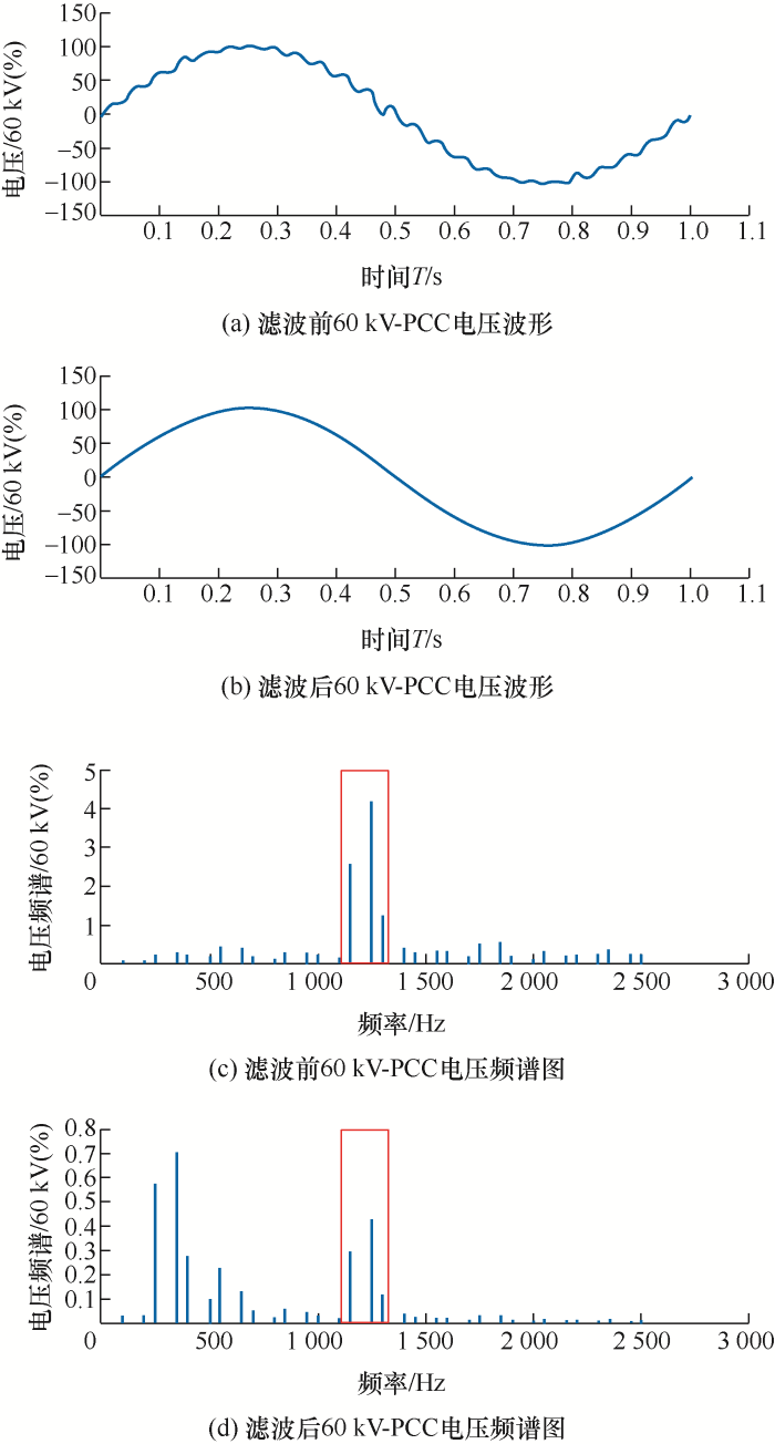 图7给出了光伏电站满负荷运行时,本文方案投切前后的60 kV-PCC的仿真结果,其中具体数据如表3和表4所示。分析可知,在滤波前,60 kV-PCC电压波形出现明显畸变,且电压畸变率远大于国际标准3%,频谱图显示主要原因为高频23次、25次、26次谐波电压分量过大。在接入本文所研究的阻波高通滤波器后,PCC电压波形明显正弦化,电压畸变率符合国际标准,且滤波率在最大最小短路容量下分别为80%和80.1%,效果显著。并且纵观各次谐波频次,高次谐波的抑制率随着谐波频次逐渐上升,且高频23次、25次、26次的谐波滤除率分别为88.7%、90.2%、90.4%,致使滤波后的电压畸变率降至0.29%、0.41%、0.12%。以国际标准限制评判,高次谐波治理后,该光伏电站谐波电压畸变合格,符合新能源发电的并网要求。
