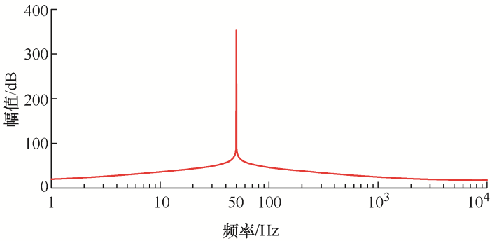 根据式(2),阻波高通滤波器的阻频特性如图2所示。分析可知,在基频50 Hz下,由于滤波电容C和滤波电感L并联谐振,阻波高通滤波器在基频下呈现高阻抗的开路特性,理论上没有基频电流通过,滤波电感L与滤波电容C的无功功率平衡,故不会改变光伏电站的无功功率潮流分布。并且随着谐波频次的递增,滤波电容的容抗逐步递减,阻波高通滤波器的谐波抑制效果逐步提高,能够有效地对高次谐波(23次、25次等)进行抑制。