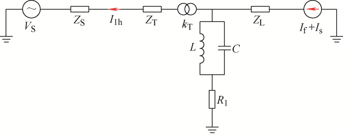 为具体分析该阻波高通滤波器在光伏电站的稳定运行情况,需要进行光伏电站整体频率分析,图3给出了光伏电站的等效电路。其中,VS为并网点的电压,ZS为系统阻抗,ZT为主升压变压器的等值阻抗,kT为主升压变压器的等效变比,ZL为22 kV以下设备的等效阻抗,IS为光伏逆变器的总输出基频电流,If为光伏逆变器的总输出谐波电流,为简化分析其中22 kV以下设备用等效阻抗基波和谐波电流源等效处理。
