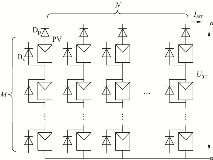 光伏阵列是光伏电池进行一系列的串并联后形成的,其结构如图5所示。其中N表示有N串光伏电池并联,M表示每串有M个光伏电池。当光伏阵列在PSC下时会出现“热区效应”,此时需要二极管Ds将存在“热区效应”的光伏电池短路。在有局部阴影时,各并联支路可能会发生电能倒送,需要在并联支路上串联二极管Dp。在理想情况下,对于M× N个光伏电池构成的阵列,其输出电流和电压为