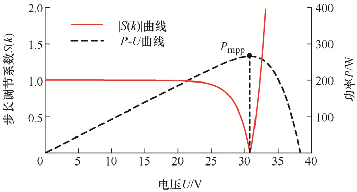 传统的INC法首先在光伏电池的P-U曲线中对功率求导,然后根据求导的结果调整步长,无法找到合适的步长以满足系统运行的要求。文献[3]提出一种步长调节系数用于INC法,当光照强度发生剧烈变化时,此调节系数能以较快的速度响应。步长调节系数为S(k)的绝对值,其中S(k)为