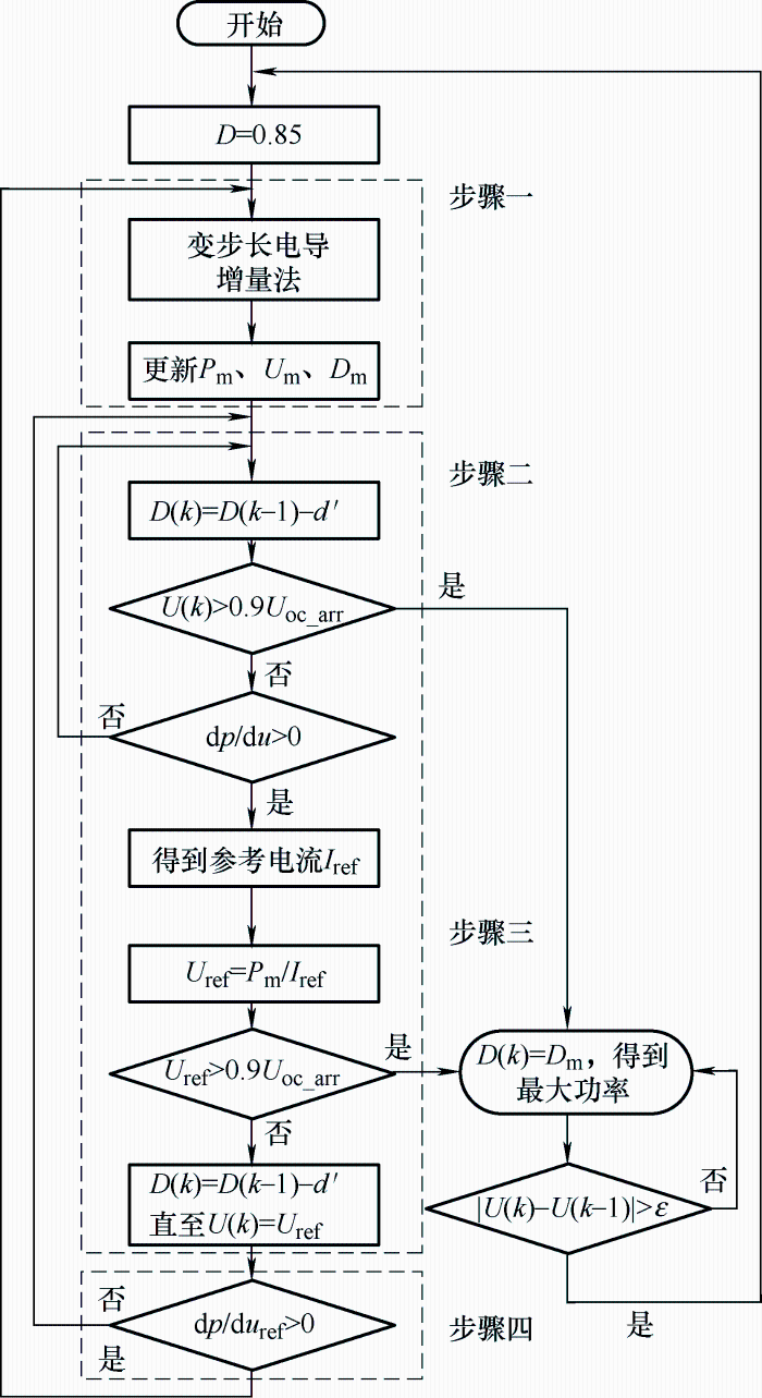 由式(7)的不等式可知光伏阵列的MPP处电压不会超过0.9Uoc_arr(Uoc_arr为标准状况下的开路电压)。因此,可通过判断电压是否超过0.9Uoc_arr,来决定是否结束算法。为节省搜索时间,有两种途径可以结束算法执行,一种是在整个算法搜寻过程中,将光伏阵列的输出电压与0.9Uoc_arr比较,一旦大于0.9Uoc_arr就结束算法;另一种是判断算法步骤三所得电压Uref是否大于0.9Uoc_arr,若比0.9Uoc_arr大,也应结束算法。