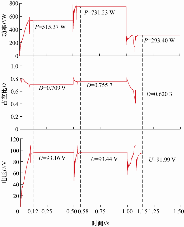 通过对所提算法中四个步骤的循环执行,不断更新搜索到的最大功率,直至阵列的输出电压大于0.9Uoc_arr或Uref大于0.9Uoc_arr,才终止算法执行。将光伏阵列的占空比设为算法执行过程中保存的Dm,即可使光伏阵列运行在GP点左右。