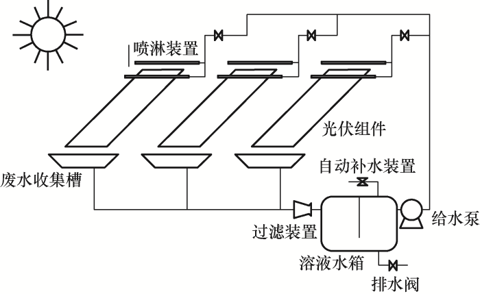 试验区域总计12个组串,通过3台隔离变压器,分别接入5台逆变器。隔离变压器的作用在于,可使不同电压等级和使用不同抗PID方法的逆变器并入同一低压电网而互不影响,如虚拟接地、反压修复以及虚拟接地+反压修复。此外,试验还设置了独立循环的喷淋系统,为全部12个组串的负极三块组件进行喷淋操作,用来模拟潮湿和高盐度的运行环境,喷淋系统示意图如图2所示。