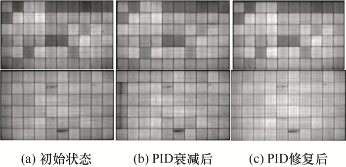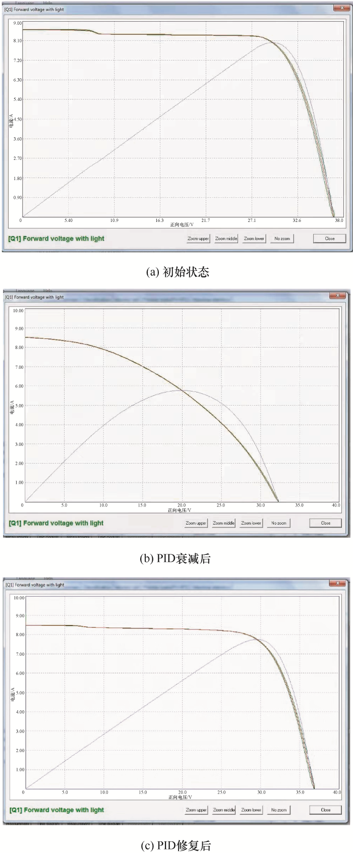 (2) 组件PID修复:在双85(温度85 ℃、相对湿度85%)条件下,测试过程中,环境试验箱中的组件正/负端子短接后电压保持0 V,组件边框处于-1 000 V的偏置电压下,测试时间为96 h。