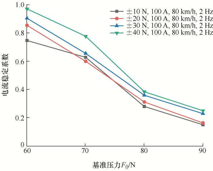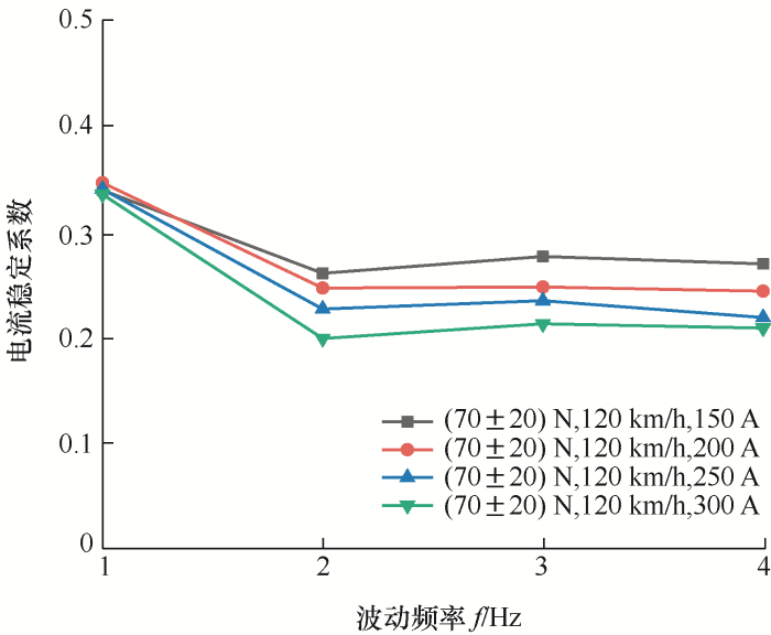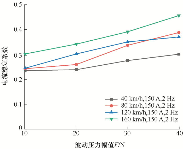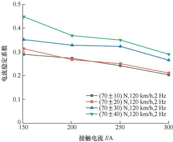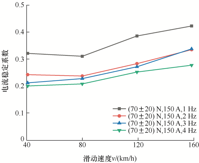 由图2可知,滑动速度为40~80 km/h时,电流稳定系数相差不大;大于80 km/h时,电流稳定系数随着滑动速度的加快逐渐升高,滑板摩擦振动和接触表面磨损加剧,磨损颗粒和氧化膜碎片积聚在表面,弓网间接触状态变差,弓网受流变得不稳定。