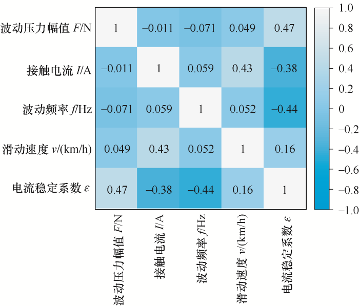 接触网正常运行是电气化铁路安全运营的前提[17]。电流稳定系数是判断滑动电接触是否失效的重要标准,电流稳定系数越小,弓网接触越可靠。为评估各影响因素与电流稳定系数之间的关系,采用斯皮尔曼等级相关系数[18]来衡量两者的相关程度。相关系数的绝对值越大,则影响因素与电流稳定系数之间的相关性越强。根据测得的数据可以得到各因素与电流稳定系数的相关性热力图,如图8所示。呈正相关的因素相关性越高,则图形颜色越浅,呈负相关的因素相关性越高,则图形颜色越深。根据热力图下边第一行可以看出,波动压力幅值、滑动速度与电流稳定系数之间呈正相关,接触电流、波动频率与电流稳定系数之间呈负相关,说明波动压力幅值或滑动速度的增加都会使电流稳定系数增大,更容易造成弓网滑动电接触失效,接触电流或波动频率的增加都会使电流稳定系数越减小,弓网接触可靠性增加。这与第2.3节的试验结果相同,证明了所采用的方法是可行的。从图8还可以得知,波动压力幅值与电流稳定系数之间的相关性最大,说明波动压力幅值是对电流稳定系数影响最大的因素。
