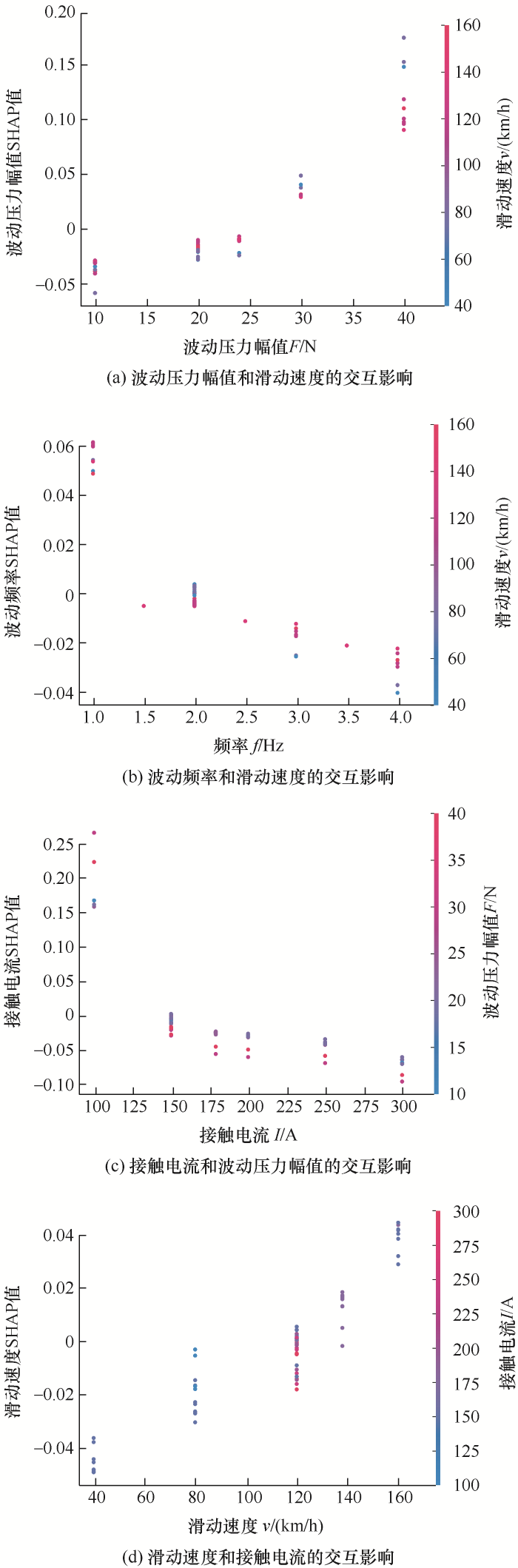 由图14a可知,整体上随着波动压力幅值的增加,SHAP值变大,电流稳定系数正向变化的风险增大。同时也显示了SHAP模型自动选择的波动压力幅值和滑动速度之间的交互效应,波动压力幅值较小时,SHAP值为负,滑动速度越大对电流稳定系数的影响越大,振动加剧,离线率增加,导致附着在接触表面的氧化膜遭到了破坏且燃弧率增大,电弧侵蚀加剧,使表面粗糙度增加。然而,在波动压力幅值较大时,SHAP值为正,离线率升高,产生离线电弧概率增大,较小的滑动速度对电流稳定系数的影响高于较大的滑动速度,更容易造成弓网受流不稳定。由图14b可知,整体上随着波动频率的增加,SHAP值减小,电流稳定系数呈反向变化趋势。同时也显示了SHAP模型自动选择的波动频率和滑动速度之间的交互效应,波动频率大于2 Hz时,波动频率的SHAP值为负值,滑动速度越大,对电流稳定系数的影响越大,滑动速度越小,则波动频率的SHAP值越低,对电流稳定系数的负向作用越明显。当波动频率的值小于等于2 Hz时,SHAP值为正值,且波动频率越小,SHAP值越大,对电流稳定系数有增大效果,此时较小的滑动速度对电流稳定系数的影响高于较大的滑动速度,受电弓滑板和接触导线频繁接触,相互撞击次数增多,表面划痕增多,使得机械磨损、冲击磨损产生的磨屑增加,经过高温与氧化的作用,在表面形成磨粒,容易发生磨粒磨损。由图14c可知,整体上随着接触电流的增加,SHAP值减小,电流稳定系数呈反向变化的趋势。同时也显示了SHAP模型自动选择的接触电流和波动压力幅值之间的交互效应,接触电流较小时,SHAP值为正,波动压力幅值越大对电流稳定系数的影响越大,较大的机械冲击会破坏碳滑板表面润滑膜,机械磨损增加,导致表面粗糙度增加。然而,在接触电流较大时,SHAP值为负,较小的波动压力幅值对电流稳定系数的影响高于较大的波动压力幅值,波动压力幅值越大,接触电流的SHAP值越低,对电流稳定系数起负向作用。由图14d可知,整体上随着滑动速度的增加,SHAP值增大,电流稳定系数正向变化的风险增大。同时也显示了SHAP模型自动选择的滑动速度和接触电流之间的交互效应,但是滑动速度和接触电流的交互作用并不明显。当滑动速度大于等于120 km/h时,对应的SHAP值为正值,滑动速度越大,使得表面烧蚀坑数量增多、范围增大,导致接触表面凸凹不平,电流稳定系数增大,弓网接触状态恶化;当滑动速度小于120 km/h时,对应的SHAP值为负值,并且接触电流值较小,说明接触电流和滑动速度都较小时,对电流稳定系数起到负向作用。