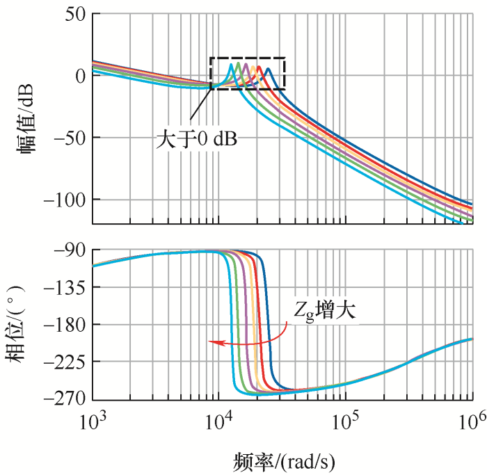 ... 在高频段,并网变换器与电网的交互作用主要体现在电流内环.LCL滤波器为一三阶欠阻尼系统,其在电流控制环中引入谐振点.阻抗Zg的波动会引起此谐振频率大范围变化,在其他控制参数固定不变的情况下,这可能导致注入电网的电流发生高频谐振[37].以图5为例,采用特征值法对该谐振不稳定现象进行机理分析. ...