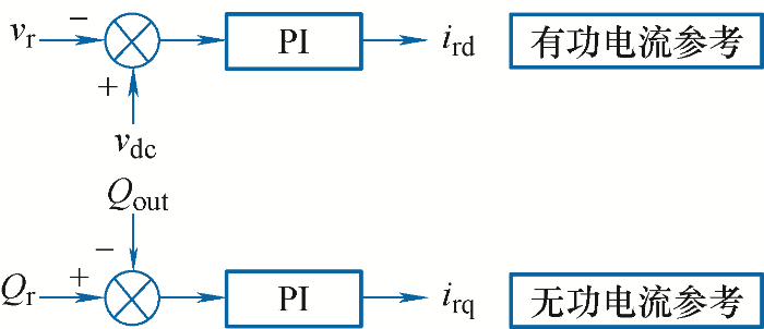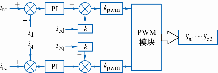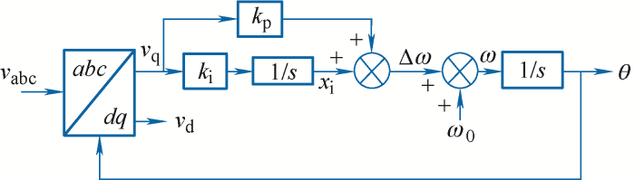 ... 旋转坐标系电流闭环矢量控制方法的一个核心关键在于准确获取并网点电压的相位,实现与交流电网的同步.图4所示单同步坐标系锁相环(SRF-PLL)是用于实现与电网同步的经典方案[26],因其具有原理简单、实现方便、响应快速等优点而被广泛采用.图4中,vabc是变换器并网点三相电压采样值,vd和vq对应并网点电压在dq坐标系中的分量,θ为计算所得电网电压相位.kp和ki是PI控制器的比例增益和积分增益,xi代表积分器的输出. ...