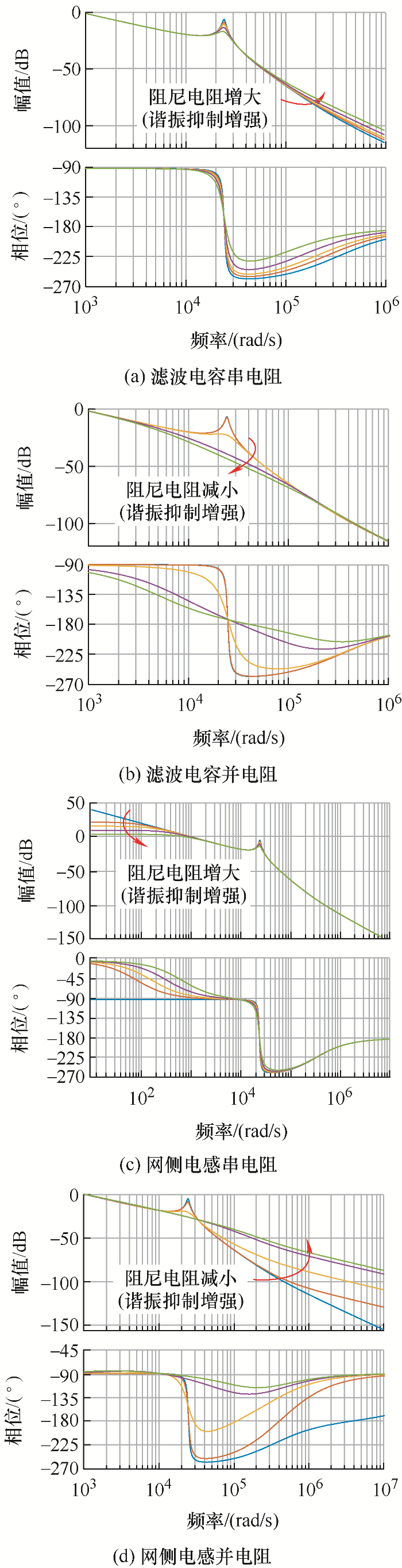 ... 为衰减滤波器与电网交互导致的谐振峰值,可在滤波电路中串、并联电阻元件,以增加系统阻尼[37-38].基本的无源阻尼方案如图8所示[39],包括网侧电感(L2)串电阻、网侧电感并电阻、滤波电容串电阻、滤波电容并电阻四种. ...