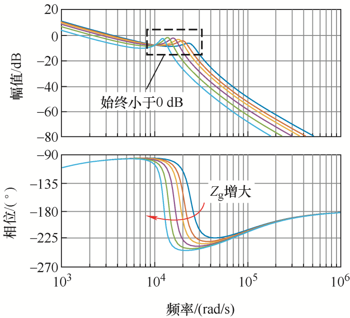 ... 基于上述分析讨论,综合考虑功耗、滤波特性以及阻尼效果,滤波电容串电阻的方案较优于其他三种方案,因此,工程中常采用这一无源阻尼方法.当设置阻尼电阻Rd=1 Ω时,图10展示了采用无源阻尼后Go(s)的频率特性随Zg波动的变化情况.对比图7可见,滤波电容串电阻的无源阻尼方案能有效降低谐振峰值,保持系统稳定.近年来,为进一步降低由电阻造成的有功损耗,一些高阶无源阻尼方案被相继提出[37],但与此同时,滤波电路复杂度上升,系统的体积变大以及成本增加. ...