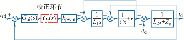 ... 对于三相系统,其d轴和q轴的控制通道之间存在耦合[24].然而,一般情况下,滤波电容C和网侧滤波电感L2的值较小,耦合通道的增益小;另一方面,是否考虑耦合通道并不影响网络阻抗的影响机理分析.因此,为突出重点,本文忽略耦合通道,认为d、q轴近似解耦.如此,d轴和q轴即具有相同的控制系统模型,图5中选取d轴为例进行说明. ...
