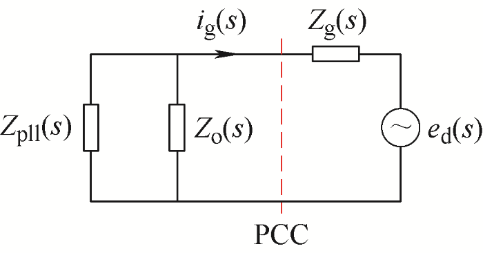... 为揭示锁相环与电流环交互作用导致系统失稳的机理,本节将基于第3.1.2节所介绍的阻抗法从阻抗概念层面进行剖析.计及锁相环动态时,并网系统的等效电路模型如图13所示[60-61].对比图6可以发现,此时,并网变换器这一子系统中不再包含有理想电流源,取而代之的是与锁相环密切相关的等效阻抗Zpll(s).也就是说,锁相环的引入使得并网变换器的等效输出阻抗模型中新增了一条并联阻抗支路. ...