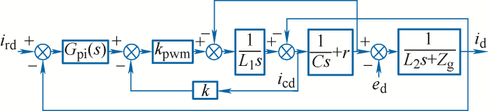 ... 针对跟网型并网变换器控制系统,以图1和图3为例,常用的分析模型如图5所示,其中,变换器和PWM模块被等效为比例增益环节kpwm,Gpi(s)为PI控制器传递函数,r为滤波电容等效串联电阻.值得指出的是,对于采用其他控制器的并网变换器,均可采用小扰动原理建立起类似的线性化数学模型[35]. ...
