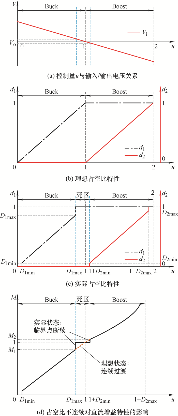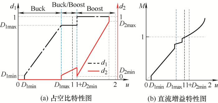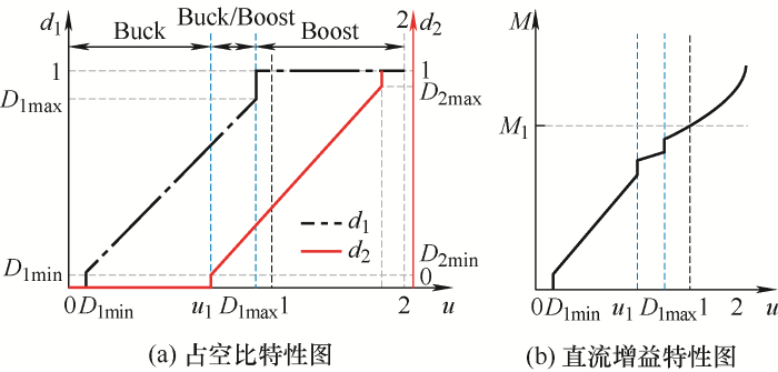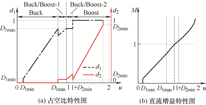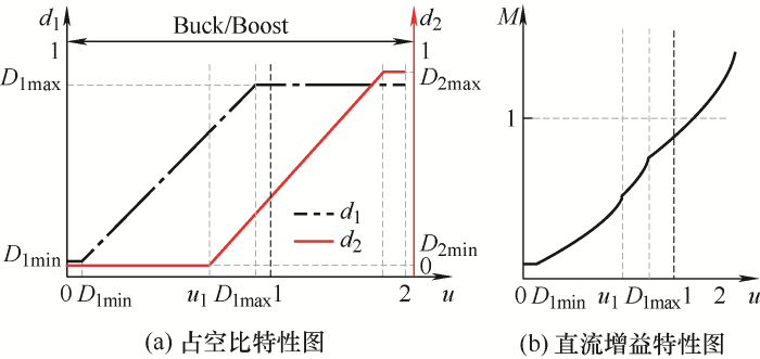 在此区域内,d1和d2独立控制,因该区域内工作模式不满足Buck模式和Boost模式工作特性,相当于新工作模式,即Buck/Boost模式。此方法可消除“直通状态”,但从图6b可看出,直流增益临界点断续依旧存在,输出电压存在跃升。同时分析电路实际工作情况,可发现由于d2特性曲线向左平移,在u∈[D1max,1]时,变换器已经提前进入Boost模式,与实际电压关系不符合,使得变换器无法正常工作。