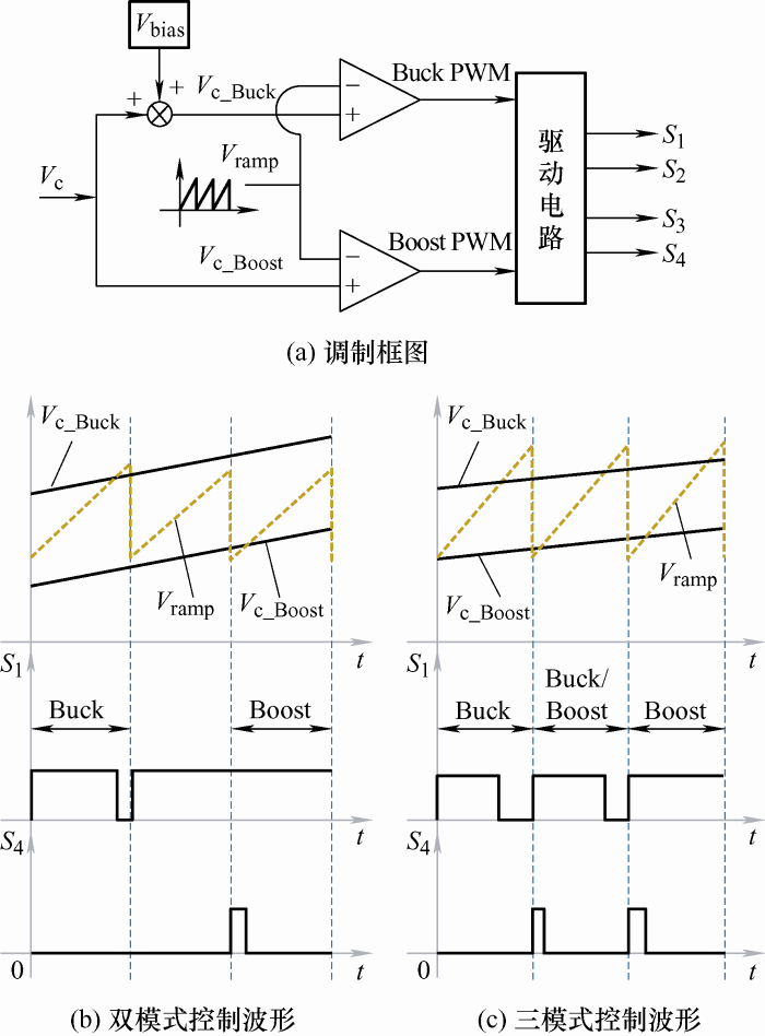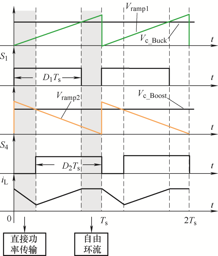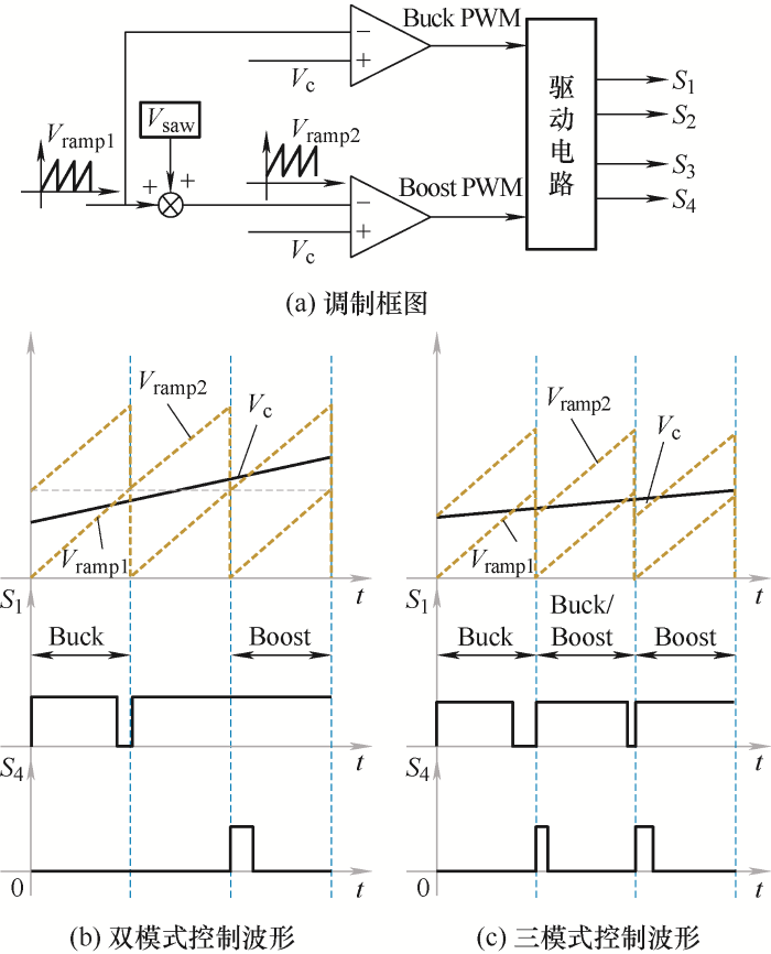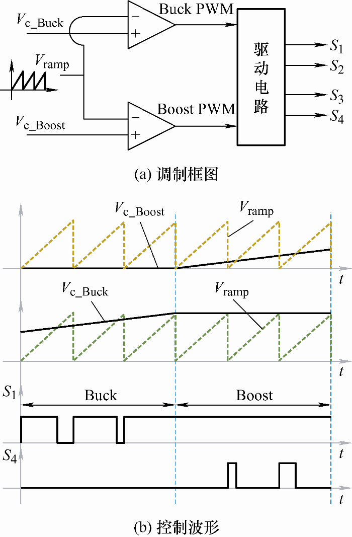 常见的改进PWM调制方式有两种,分别为单调制信号-双载波控制与双调制信号-单载波控制调制[47]。需要说明的是,改进PWM调制方法,适用于控制器仅有一个控制信号输出的场景,即多种工作模式由单个控制环路控制。