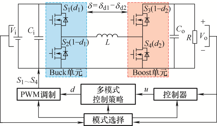 单模式控制的四开关变换器仅有一种工作模式,即图2中的S1和S4同开同关。双模式控制可根据输入输出电压比调整变换器的工作模式,当输入电压高于输出电压时工作在Buck模式,反之则工作在Boost模式。三模式控制是在双模式控制的模式切换区间增加了一个过渡模式,即Buck/Boost模式。单模式控制实现简单,但效率不高;双模式控制下可大大提升效率,但当输入电压接近输出电压时,模式间切换效果会对系统的稳定性造成影响;三模式控制基于双模式控制,在模式切换处引入过渡模式(Buck/Boost模式),以实现平滑模式切换,但过渡模式通常会带来额外的损耗,且增加了控制复杂度。相较而言,多模式控制实现方式简单,能量传输效率高,因此,四开关Buck-Boost变换器的控制中大多采用此种方法。