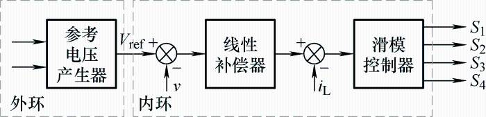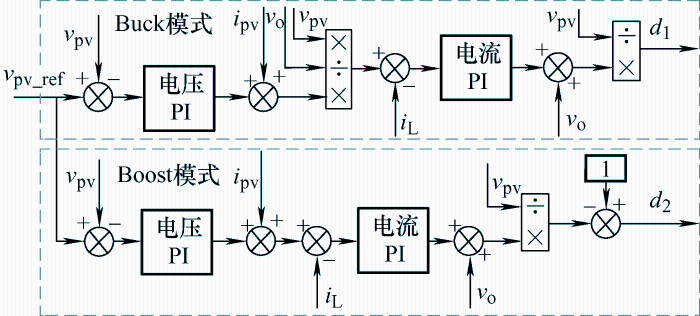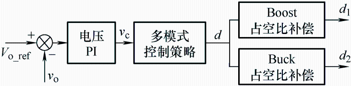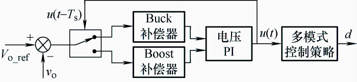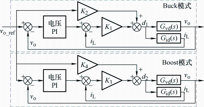 四开关Buck-Boost变换器的控制器研究中,早期的研究强调输出电压控制,常使用单电压控制器,配合多模式控制策略或改进PWM调制,实现变换器的控制目标,但单电压环控制动态性能不足,同时,由于不同模式的传递函数特性不同,若共用一个控制器,在保证系统充分稳定的前提下将牺牲变换器的动态响应速度。针对单电压环控制存在的种种问题,基于线性控制方法,学者们进行了控制器的改进研究。