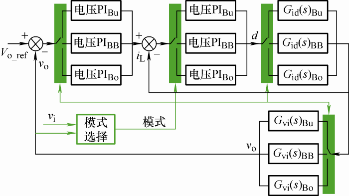 为了实现模式间平滑切换,提高变换器的整体性能,控制器环节的设计需要进行全面考虑。四开关Buck-Boost变换器有多种工作模式,对于此类多模式变换器,常基于线性控制方法,设计多模式控制器,即根据实际需求,建立不同模式的补偿环路,虽然能实现预期的控制目标,但存在控制结构复杂、动态性能不足等问题;近年来,具有良好暂态特性的非线性控制方法,在多模式变换器中逐渐得到了应用。下文将基于线性控制方法和非线性控制方法,对变换器的控制器环节进行阐述分析。