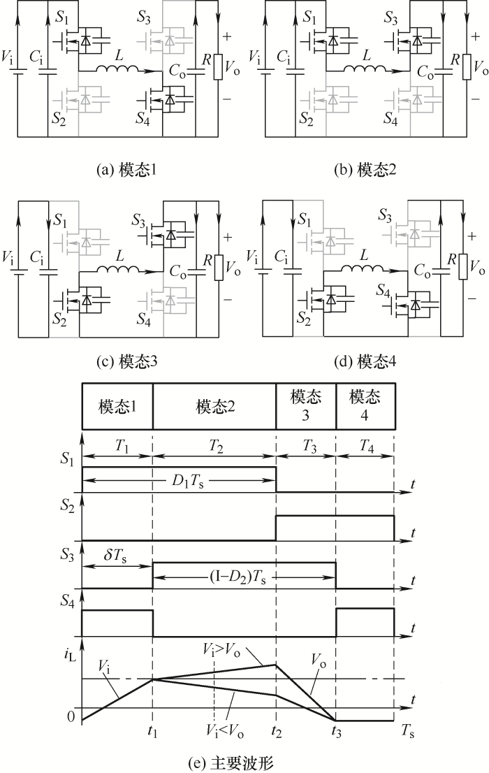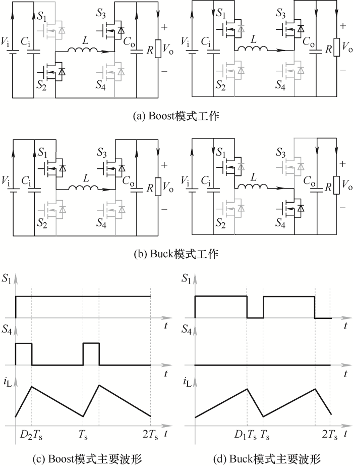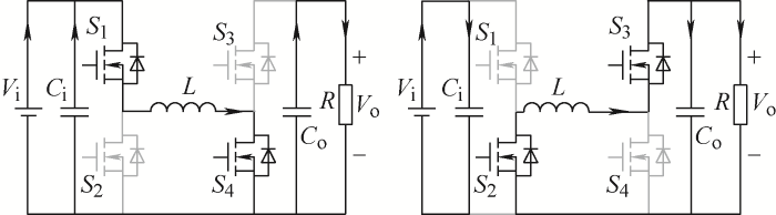 需要说明的是:① 四开关Buck-Boost变换器可控制功率双向流动,每一侧既可作为“输入”,也可作为“输出”,为避免歧义,在本文中,定义左侧为输入侧,右侧为输出侧,输入电压为Vi,输出电压为Vo;② 本文中变换器预期目标为实现输入电压宽范围变化,得到稳定的输出电压。尤其当输入电压范围与输出电压有重叠。