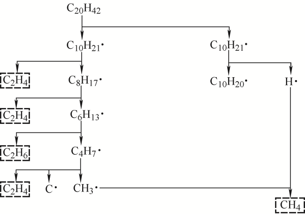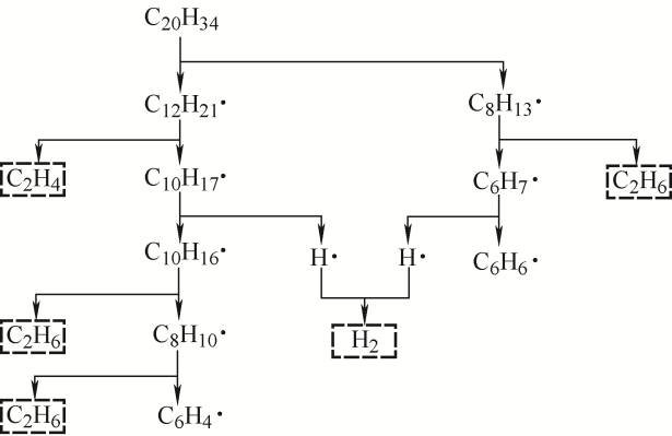 (2) 环烷烃C20H34的热老化机制。环烷烃C20H34的热老化分解过程如图11所示,与上述烷烃类似,开环后产生的自由基不断裂解,生成稳定的小分子气体,不同的是环烷烃分子C20H34受热不断老化后,会生成乙烯、乙烷和氢气。