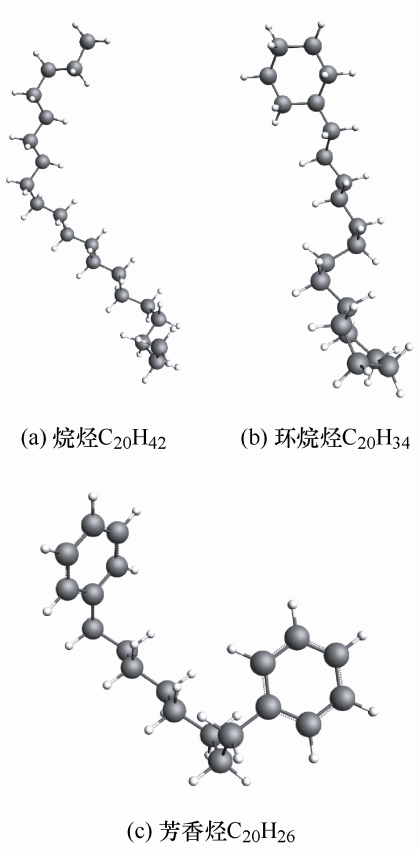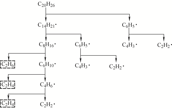 (3) 芳香烃C20H26的热老化机制。芳香烃C20H26的热老化分解过程如图12所示,芳香烃受热后苯环脱落,分解为C14H21•和C6H5•自由基。C14H21•受热后继续分解,生成C6H5•以及C8H16•自由基, C8H16•继续分解,生成C6H10•和C2H6,C6H10•自由基继续分解,生成C4H6•和C2H4,C4H6•继续分解,生成C2H2•自由基和C2H4。而第一次分解得到的C6H5•自由基受热后也会继续分解为C4H3•以及C2H2•自由基。需要说明的是,这一系列反应中生成的C2H2•为自由基,并非乙炔。即一个芳香烃分子C20H26受热不断老化后,会生成乙烯和乙烷。