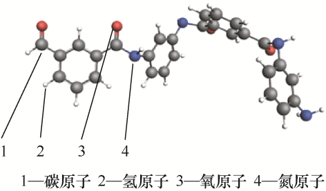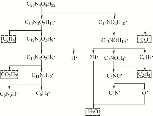 (4) PMIA分子的热老化机制。PMIA分子C28N4O4H22的热老化分解过程如图13所示,PMIA分子C28N4O4H22受热后酰胺键(C—N)断裂,分解为C14N3O2H12•和C14NO2H10•自由基,其中,C14N3O2H12•会持续分解,生成C2H4和甲酸CO2H2。另一产物C14NO2H10•自由基受热后也会继续发生分解,生成CO、C2H4和H2O。