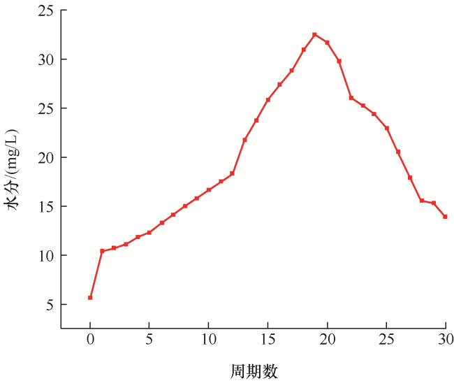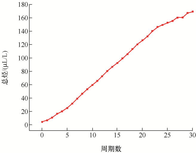 本文选取总烃作为溶解气体分析的指标,总烃含量随老化周期的变化规律如图9所示,在老化试验开始前为3.62 μL/L,数值处于较低水平。随着老化时间增长,总烃含量开始上升,证明绝缘纸和绝缘油都发生了老化,且随着老化时间增加老化程度也增加,到第25个老化周期的时候,该值达到了152.56 μL/L,已经超过了运行中动车组变压器油总烃≤150 μL/L的标准值。当达到第27个老化周期的时候,增长速率开始变缓,到第30个老化周期时,绝缘油的总烃含量达到了169.13 μL/L,此时比标准值多了19.13 μL/L,严重不满足要求,可见老化程度较为严重。