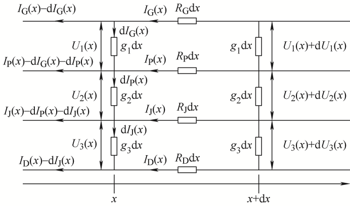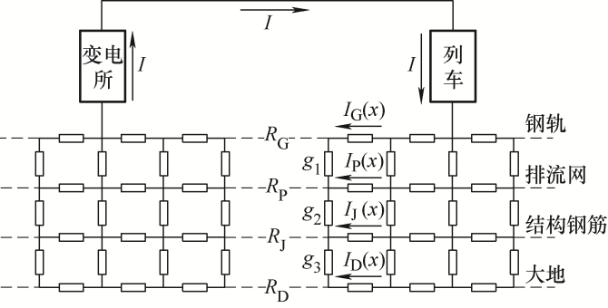 图1中,RG、RP、RJ、RD分别为钢轨、排流网、结构钢筋、大地纵向电阻;IG/P/J/D(x)为各层在x处的电流。
