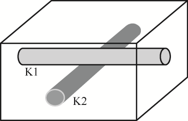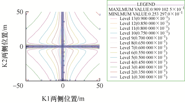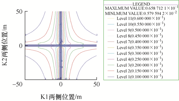 为建立符合实际的地铁杂散电流模型,避免因过度简化造成杂散电流仿真结果不准确,现基于CDEGS建立地铁交叉线路隧道仿真模型,上层隧道标号K1,下层隧道标号K2。地铁交叉线路相对位置空间如图3所示。