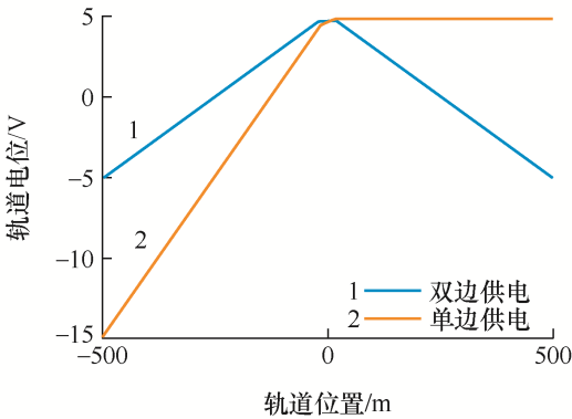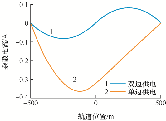 (1) 直流牵引供电系统在线路交叉的情况下,单边供电方式较双边供电方式产生的杂散电流更为严重;在列车及再生制动工况下,由于所需及产生的电流较大,杂散电流也较大。