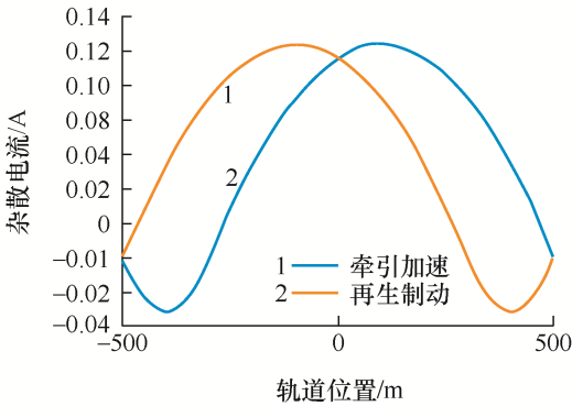由于牵引加速工况下列车向钢轨注入电流,在再生制动工况下,列车向牵引网注入电流,所以杂散电流的方向不同;但是因为牵引电流与再生制动电流相同,供电区间内的杂散电流总量相等。杂散电流主要集中于列车至变电所较长的区段内,因为电流经较长的钢轨回流,钢轨电流又经钢轨扣件泄漏至地下,较长的钢轨扣件较多,钢轨电流更易泄漏至地中形成杂散电流。